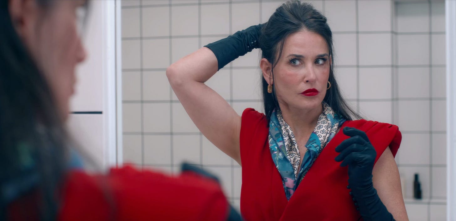 Demi Moore plays a TV aerobics instructor who’s fired when she turns 50. Desperate to stay in the spotlight, she avails herself in the black market drug, a substance–uh-huh–that births from her body a younger, entirely separate version of herself very squelchily. But there’s a catch. She has to switch back and forth between her two bodies every seven days or things are going to get weirder and somehow even squelchier.